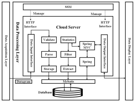 The SSM framework was a relatively mainstream Java EE enterprise open-source framework, suitable for building various large-scale enterprise application systems. The SSM framework had the advantages of (1) low cost, (2) savings on development time, (3) good scalability, and (4) good maintainability. Therefore, this study chose the SSM framework to build a server-side program. The software architecture design was based on the SSM framework (Figure 3). The data acquisition layer performed the function of receiving exhaust measurement data from the monitoring equipment. The data processing layer included the validation, parsing, and storage of data, as well as the users’ feedback query of the ship’s emissions information, which was sent to the data display layer. Statistics, filtering, extraction, and other such data analysis modules were simultaneously set up in this layer to provide information services that could be used for scientific research or maritime supervision. MyBatis used annotations to interact with the database, and performed the operation of adding, deleting, modifying, and checking of data. The front-end program was designed using the Vue framework, which had the advantages of componentization, lightweight code, and fast processing speed. These programs ran in cloud services and could be distributed to different cloud computing nodes according to the specific business volume.
