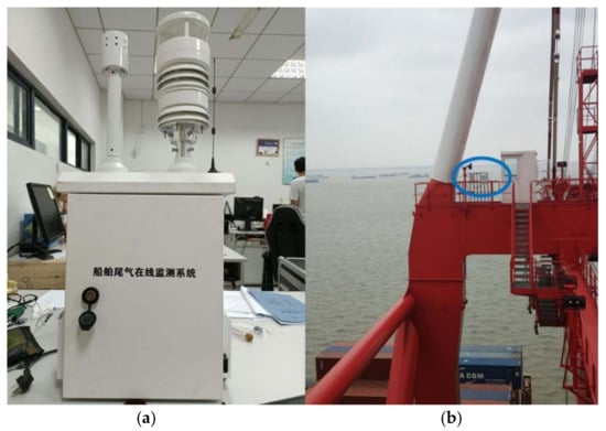 (a) Hardware photo (the title on it means on-line monitoring system of ship exhaust) and (b) monitoring site.