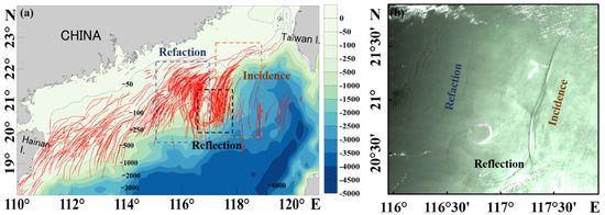 Figure 1a shows the spatial distribution of ISWs in the northern SCS: the red stripes are the leading wave crest lines manually extracted from MODIS images. The figure also shows different types of ISWs on both sides of the Dongsha Atoll. The eastern side mainly contains the incident ISWs that extend north to south for hundreds of kilometers, as well as the arc-shaped reflected ISWs; the western side contains many the refracted ISWs, which appear as two branches and can propagate to the near-shore continental shelf. The black box in Figure 1a, the area delineated in this paper, is where reflected ISWs often appear and reach as far east as 117.5° E. Figure 1b shows a MODIS image, in which the incident, refracted, and reflected ISWs exist simultaneously. The reflected ISWs are in a semicircular arc and are composed of 3 to 5 solitons. The length of the crest line of the leading wave is approximately 150 km.
