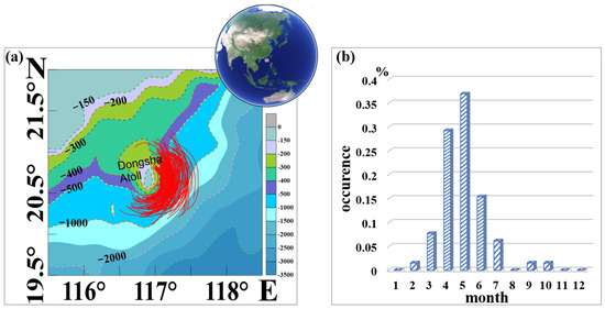 Using the crest lines of leading waves, the spatial distribution of the reflected ISWs is shown in Figure 2a. They mainly exist in the form of wave packets, which partially surround the Dongsha Atoll. Compared with the incident and refracted ISWs, the spatial range of the reflected ISWs is more concentrated, mainly from 116.5° E to 117.5° E and from 20° N to 21° N. The results of Sun et al. showed that ISWs in the northern SCS mainly occurred from April to September [29]. Consistent with their results, the time distribution map of reflected ISWs in Figure 2b shows that the reflected ISWs occurred mostly in May and accounted for 35% of the total number, and the total proportion from April to June reached up to 80%. Due to the relatively weak energy of the reflected waves, the features caused by the sea surface are not obvious, so they may not be detected by satellite imagery. However, according to the overall temporal distribution of ISWs in the northern SCS and the fact that the seawater stratification phenomenon is significant in summer, it can be inferred that April to June is a high-frequency period of the reflected ISWs.