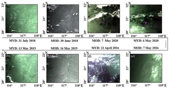 To analyze the morphological and spatiotemporal distribution of the reflected ISWs further, information on ISWs was extracted from MODIS images. MODIS is an optical sensor onboard the Terra and Aqua satellites, which have a total of 36 channels; a swath width of 2330 km; spatial resolutions of 1000, 500, and 250 m; and a transit time interval of 3 h. This work downloaded and processed 720 MODIS images covering the continental shelf near the Dongsha Atoll from May 2015 to May 2021 with a resolution of 250 m. The channel locations for images were 0.62–0.67 µm and 0.841–0.876 µm. After geometric and radiometric corrections, 70 groups of reflected ISWs were obtained. Image information is shown in Appendix A.