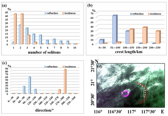 Based on the preprocessed MODIS images, we extracted and calculated the characteristics of ISWs: position, number of solitons, and propagation speed. In addition to the 70 groups of reflected ISWs mentioned above, 100 groups of incident ISWs were processed. Figure 4 shows the characteristic parameter distribution of the incident and reflected ISWs. As shown in the figure, reflected ISWs often exist in the form of wave packets. The number of solitons in a packet is usually between 2 and 5, but packets with more than 8 can appear, while the number of solitons in the incident ISWs mainly ranges from 1 to 3. The lengths of the crest lines of the reflected ISWs were mainly between 50 and 150 km, accounting for more than 80% of the total, whereas the crest lines of the incident ISWs were longer, reaching 250 km. The number of solitons exceeding 100 km accounts for approximately 90%. Figure 4c shows that the propagation direction of the reflected ISWs centered at 90° was northeast and southeast. The proportion of reflected ISWs propagating to the southeast accounted for 70%. The incident ISWs propagate westward, ranging from 240° to 300° E, and more than 80% propagated to the northwest. Figure 4d shows an example calculation of the speed of an ISW based on the multiphase method (MPI) [31,38]. MPI is based on satellite images of the same ISWs acquired at different times, which means the propagation speed of ISW can be calculated according to the propagation distance and the time difference between the satellite images. In this work, 3 groups of reflected ISWs and 5 groups of incident ISWs were matched and processed. The average speed of the incident ISWs was 2.57 m/s, while that of the reflected ISWs was 1.57 m/s, accounting for only 60% of the incident ISWs.