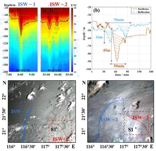 As mentioned above, some incident ISWs collide with the Dongsha Atoll and then refract and continue to propagate westward, while the rest are reflected and propagate eastward. Figure 5 shows a set of measured data and two remote sensing images, of which Figure 5c is a MODIS image acquired at 02:55 UTC on 21 May; Figure 5d is a FengYun-3D image acquired on 21 May at 05:25 UTC. FengYun 3D is China’s polar-orbiting meteorological satellite having a resolution of 250 m and a swath width of 2800 km. As shown in Figure 5c,d, there was a large refracting ISW packet (ISW-1, blue) with a crest line up to 105 km propagating westward from the western side of the Dongsha Atoll, while there was an arc-shaped reflected ISW packet (ISW-2, red) on the northeast side of the Dongsha Atoll. The propagation speeds of the refracted and reflected ISWs calculated from the images were approximately 1.45 and 1.6 m/s, respectively. Combined with the speed and the distance between them, this work suggests that the two wave packets originated from the same incident ISW, which was recorded by in situ observations. It passed site S1 at 16:00 on 20 May, after which some of it propagated westward and evolved into ISW-1, as shown in Figure 5c,d; the rest of the ISW propagated eastward after reflecting off the Dongsha Atoll, evolving into ISW-2 and passing through site S1 again at 03:00 on 21 May.