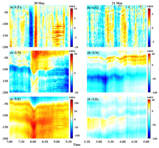 Current velocity profiles measured by ADCP (a-1–a-3) the incident ISWs on 20 May; (b-1–b-3) the reflected ISWs on 21 May. Panels 1 to 3 show the vertical, radial and zonal currents, respectively.