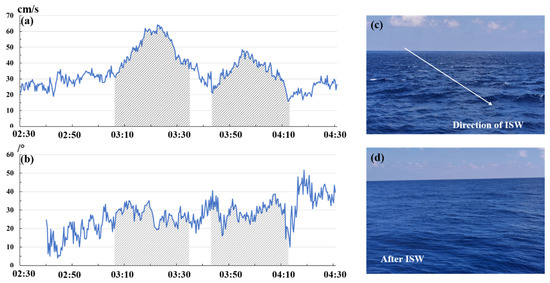 Figure 7 shows the result of the change in sea surface current caused by the reflected ISWs measured by the AAnderaa current meter. Figure 7a shows that ISWs accelerate the velocity of the surface current, and the amplitude of the maximum velocity was approximately 0.60 m/s, accounting for 30% of the propagation speed, which doubled when there was no ISW disturbance. Figure 7b shows that ISWs did not cause a significant change in the direction of the surface current, which may have been due to the greater influence of surface waves and wind. Images of the sea surface when the ISWs arrived and after their passage were captured by the camera. As shown in Figure 7c,d, when the ISWs arrived, the wave-breaking phenomenon of the sea surface intensified due to convergence; then, due to divergence, the sea surface became smooth. Osborne and Burch described the phenomenon of current divergence after ISW passage as the “mill-pond effect” [8], and Craig et al. proposed an alternative explanation of radiative absorption into the bound states of the Schrödinger equation [39].