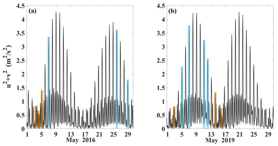 Tidal energy at the wave generation point (122° E, 20.5° N) in the Luzon Strait. (a) May 2016; (b) May 2019.