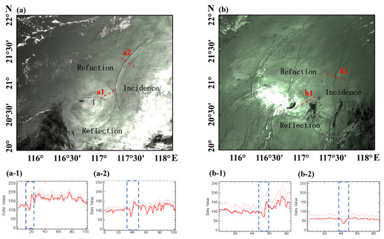 ISW mode changes. (a) MODIS image acquired on 29 May 2018; (b) MODIS image acquired on 9 May 2020. The red dashed cross-sections in panels (a) and (b) are ISWs of interest, which are shown as (a-1,a-2) and (b-1,b-2) in the subfigures, respectively; the blue boxes in the subfigures are ISW cross-sections.