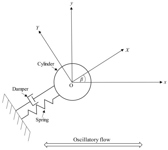 The cylinder is elastically mounted and vibrates in a sinusoidal oscillatory flow as shown in Figure 1. A cartesian coordinate system Oxy is defined with its origin located at the center of the static balance position of the circular cylinder, and the x-direction following the flow direction. The angle between the flow direction and the vibration direction of the cylinder is β. Another coordinate system, OXY, is defined with its x-diretion following the vibration direction of the cylinder. The velocity, the time and the pressure are nondimensionalized as , and pressure , where u and v are the fluid velocity components in the x- and y-directions, respectively, is the amplitude of the oscillatory flow velocity, D is the cylinder diameter and p is the pressure. A tilde, ‘~’ on top of a variable represents a dimensional value. The cylinder elastically supported by a spring and a damper is only allowed to vibrate in the x-direction. The nondimensioinal incoming flow velocity is a sinsoidal function of time: