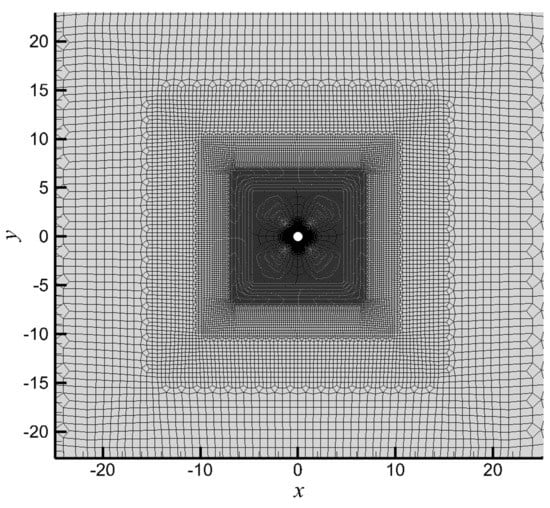 The Petrov–Galerkin finite element method by Zhao et al. [] is used to solve the NS equations. In the ALE scheme, the computational mesh needs to be moved based on the updated position of the cylinder. The displacements of the mesh nodes in the x- and y-directions are solved by the following equations []:
