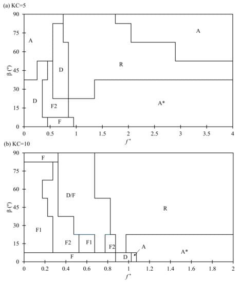 All the identified flow regimes are mapped on the f *–β plan in Figure 3. The newly identified regime R is found to occupy large range of f * in the map. Regime D/F is only found at KC = 10. At β = 0° and 90°, Regimes F1 and F2 do not exist because the configuration is symmetric.