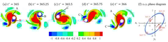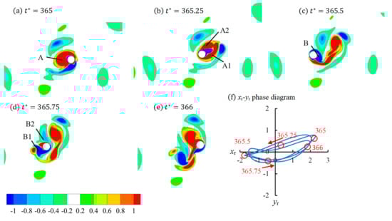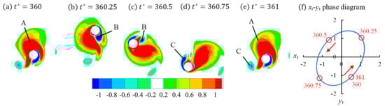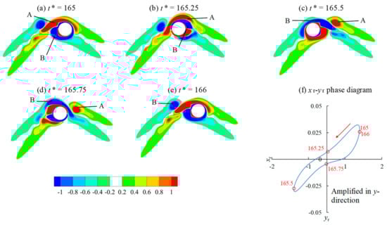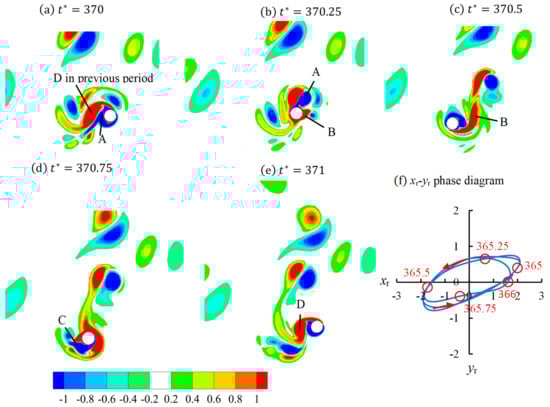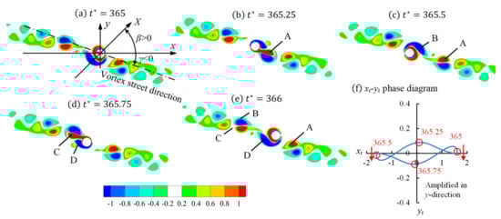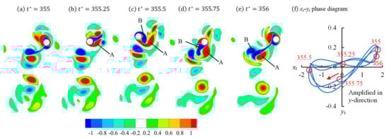 Figure 4f shows the relative displacement of the cylinder to the fluid. The nondimensional relative displacements in the x- and y-directions are defined as and , where and are the nondimensional displacement of fluid particles calculated by and , respectively. The vortex flow pattern in Figure 4 is the same as Regime F in the stationary cylinder because the relative displacement is negligibly smaller than , i.e., the cylinder vibrates nearly in the x-direction only relative to the fluid.