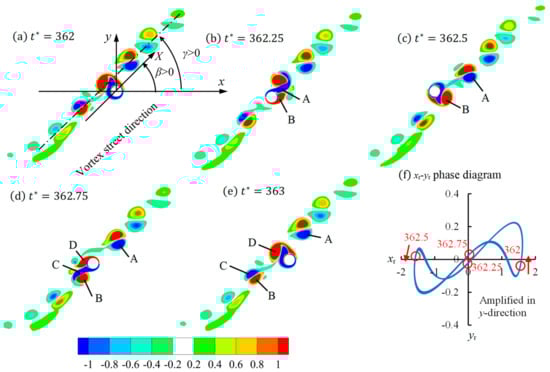 In Figure 3, KC = 10 and β = 45° have all the flow regimes except A/A*. This combination of KC and β are used as an example to explain all the flow regimes. Figure 4a–e uses contours of vorticity to show the flow patterns of Regime F1 for KC = 10, within one flow period. A vortex street alignment angle, γ, is defined as the angle between the vortex street direction and the positive x direction, as indicated in Figure 4a. The vortex street angle γ follows the anticlockwise direction. In regime F1, the vortex street direction angle is negative, i.e., opposite to the vibration direction angle. The flow regime F was found when the cylinder is stationary or vibrates in the streamwise direction (β = 0°). The regime F flow pattern at β = 0° is the same as the one shown in Figure 4, but the vortex street angle could be either positive or negative because of the symmetry of the configuration. In regime F1, two pairs of vortices (labeled as A to D in Figure 4) are shed from the cylinder in one period of flow and they are on two sides of the cylinders, respectively, forming a two-branch vortex street. After vortices B and D are shed from the cylinder before the flow reverses at t = 365.5 and 366, respectively, they are moved to another side of the cylinder by the reversed flow, while vortices A and C remain on the side of the cylinder where they are shed.