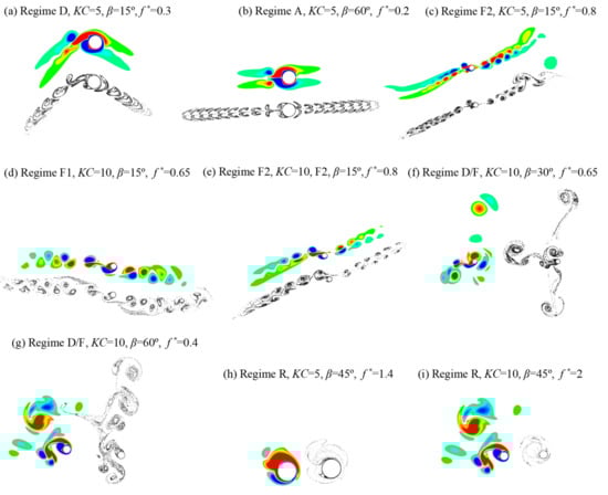 This section is arranged as follows. First, all the flow regimes for KC = 5 and 10 are mapped on the plane in Figure 3a,b, respectively. Then, detailed flow visualization of every flow regime mapped on Figure 3 is discussed. Simulations were conducted for β values ranging from 0° to 90° with an interval of 15° and the values of ranging from 0 to 4 with an interval of 0.25. As a result, the resolution of the boundaries between regimes is 15° in β and 0.25 in . Because the flow near most of the boundaries between the regimes on the map is unstable and aperiodic, we did not further refine the resolution of the boundaries.