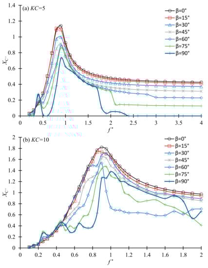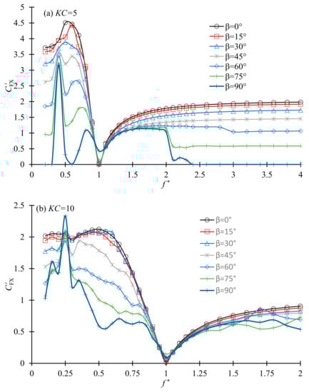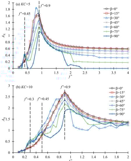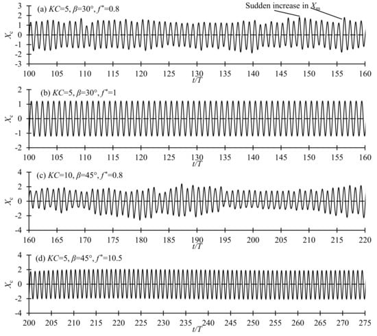 Figure 13 shows the variation of the vibration amplitude with the frequency ratio for KC = 5 and 10. The vibration amplitude is defined as , where is the maximum displacement within one period. The maximum vibration amplitude within the last 100 periods is shown in Figure 13. The vibration amplitude is found to peak at about f * = 0.9 for all the values of β and both KC numbers. It peaks at a natural frequency ratio slightly smaller than 1 instead of 1 because of the effect of the added mass of the fluid. The peak value of Xm reduces with the increase of β, except β = 30° and 15° for KC = 5 and 10, respectively. The time histories of the vibration shown in Figure 14 explain why the maximum vibration amplitude at β = 30° and 15° are higher than those of β = 0°. In Figure 14a, the vibration is irregular and occasionally vibration amplitude increases suddenly in one or two periods as indicated. Aperiodic force and vibration of cylinders in oscillatory flow at boundaries between flow regimes were also reported [,]. The occasional increase of the local Xm causes the abnormal increase in the Xm in Figure 13. In Figure 14c, the vibration is also irregular and Xm does not remain constant. The vibration time history becomes strongly aperiodic when the vibration is in Regime D/F and periodic when the vibration is in other regimes. The standard deviation of the vibration () shown in Figure 15 is obtained using 100 periods of data. is proportional to averaged amplitude of the vibration of all the 100 periods. It can be seen in Figure 15 that, generally, follows the same trend of Xm and the peak value of decreases with the decrease in β.