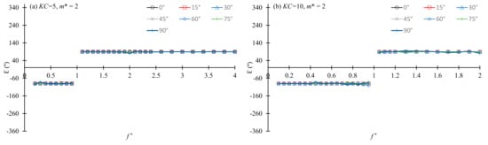 Figure 16 shows the variation of the standard deviation (SD) of the nondimensional force in the vibration direction of the cylinder with the natural frequency ratio. The nondimensional force is defined as , where FX is the dimensional force and the standard deviation (SD) of is represented as . The variation of Xm with in Figure 13 does not follow the trend of because the frequency of the force plays a significant role in the vibration also, in addition to the magnitude of the force. The nondimensional force in the vibration direction reaches its minimum value at = 1 for both KC numbers. The sudden jump of the phase between the force and velocity in the x-direction can be seen in Figure 17. When β is close to 90°, a maximum value of occurs at slightly smaller than 0.5 for KC = 5 and 0.25 for KC = 10. Because the damping ratio is 0 in this study, there is not any net energy transferring between the fluid and the cylinder. This is the reason why the phase between the vibration velocity and the force is either −90° or 90°. The phase ε changes from −90° to 90° as exceeds 1 for all the vibration direction angles in Figure 17. Because the vibration amplitude in Figure 13 and the SD of force in Figure 17 are not correlated with each other, the degree of vibration cannot be purely estimated based on the magnitude of force.