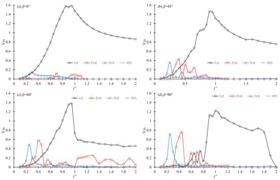 The maximum vibration amplitude occurs at , instead of 1, because of the effect of the added mass. This maximum vibration amplitude decreases with the increase in β. The second and third harmonics of the vibration displacement increase with the increase in vibration direction angle β in the low range. The dominance of the higher-order harmonics in Figure 18 leads to local maximum values at = 0.4 and 0.25 in Figure 15a,b, respectively.