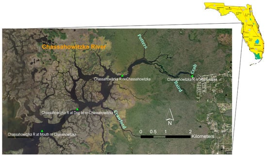 - Herrick, G.; Chen, X.; Anastasiou, C.; Basso, R.; Mendez-Ferrer, N.; Ortega, N.; Rogers, D.; Leeper, D. Reevaluation of Minimum Flows for the Chassahowitzka River System; Southwest Florida Water Management District: Brooksville, FL, USA, 2019. [Google Scholar]