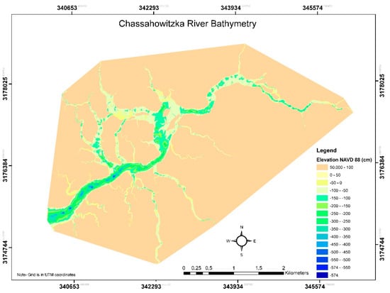 The Chassahowitzka River estuary (Figure 1) originates in Citrus County in the State of Florida, USA, and flows to the Gulf of Mexico at Chassahowitzka Bay. The river is about 9 km long, with a mean depth of 0.9 m, or 3 feet []. The width of the Chassahowitzka River varies between about 30 m or less in the upstream portion of the river and over 550 m near its mouth. Figure 2 shows a map of the bathymetry data surveyed in the Chassahowitzka River estuary []. As can be seen from the figure, relatively deeper areas exist only in the downstream quarter of the main stem of the Chassahowitzka River, where the bottom elevation of the river is about −3.0 m, NAVD88 or lower, with several deep holes being −5 m, NAVD88 or deeper. In the most upstream 10% of the river, the river bottom is generally shallower than −1 m, NAVD88. There are several shoals in the upstream reach, where most of the bottom is shallower than −0.5 m, NAVD88, except for areas in the navigation channel. All the tributaries and distributaries are very shallow, with the bottom elevation generally being higher than −1 m, NAVD 88.