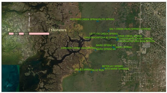 Figure 3 shows the locations of the spring vents that discharge groundwater flows to the Chassahowitzka River. The Chassahowitzka Main Spring, Chassahowitzka #1, Chassahowitzka #2, and several unnamed springs upstream of the headwaters for the Chassahowitzka River []. Many spring flows discharging to the Chassahowitzka tributaries are insignificant, except for the Crab Creek spring, the Potters Creek spring (including Ruth spring), Baird Creek springs, and those flowing to the Crawford Creek, possibly from the Beteejay spring and Rita Marie springs. Please see Figure 1 for locations of the Crab, Potters, Baird, and Crawford creeks.