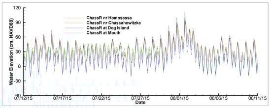 Measured water elevations at the CRH (red line), CRC (green line), CRD (blue line), and CRM (black line) stations in the Chassahowitzka River during a 30-day period, from 13 July 2015 to 11 August 2015.