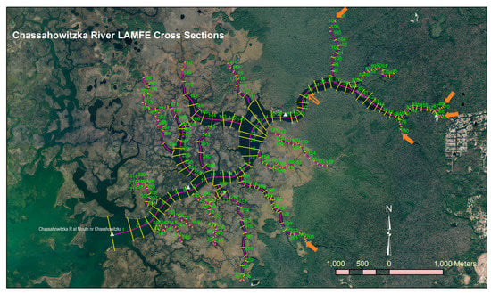 The Chassahowitzka River system was discretized with 348 grids along the river’s main stem and its 19 branches, with a horizontal spacing of the grids varying between 10 m to 370 m. Figure 6 shows cross-sections that form the 348 LAMFE grids along the main stem of the Chassahowitzka River and its branches. The water body was discretized with 15 layers between elevations −5.1 m, NAVD88 and 3.3 m, NAVD88, with the layer thickness varying from 0.3 m to 1.2 m. With this discretization, major physical characteristics of the estuary can be reasonably resolved in the LAMFE model.