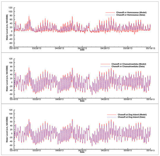 Comparison of measured and simulated water levels at the CRH (top panel), CRC (middle panel), and CRD (bottom panel) stations from 19 March 2013 through 18 May 2013.
