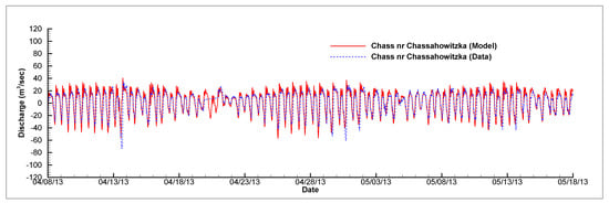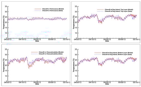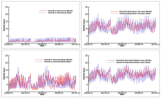 Figure 7, Figure 8, Figure 9 and Figure 10 present comparisons of model results of water level, salinity, temperature, and discharge with measured field data at the three measurement stations in the Chassahowitzka River. In these figures, red lines are model results, while dashed blue lines are measured data. For simplicity and clarity, only 60 days (19 March 2013–18 May 2013) of simulated and measured water elevations are shown in Figure 7. For the same reason, only 40 days (8 April 2013–18 May 2013) of comparisons of simulated and measured salinities, temperatures, and discharges are presented in Figure 8, Figure 9 and Figure 10, respectively. The choice of these 60-day or 40-day periods is arbitrary. Comparisons of model results with real-time field data during other time periods are similar, with some having a slightly better match and some a slightly worse match. Plots showing visual comparisons of model results with field data of water level, salinity, and temperature during other time periods can be found in Chen [].
