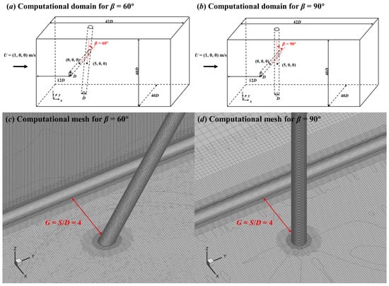 Rectangular computational domain and computational mesh for the two crossing circular cylinders in 60° (a,c) and 90° (b,d) arrangements with G = 4.