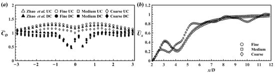 The sectional drag coefficient was defined as CD = 2FD/(ρDdL), where FD is the sectional drag force calculated by integrating the pressure and shear stress along the section circumference parallel to the inflow direction. Each cylinder was divided into 400 blocks along the cylinder’s spanwise direction, so that dL was the cylinder length divided by 400. It is clear from Figure 3a that the D of UC calculated by the medium mesh and that of DC calculated by the fine mesh was closer to the results obtained from Mesh 1 in []. For the wake region, the x obtained from the medium mesh was similar to that of the fine mesh (Figure 3b).