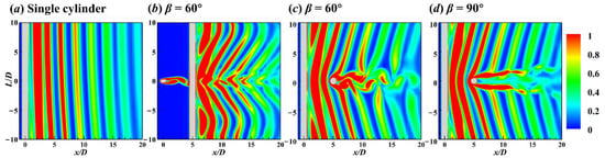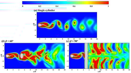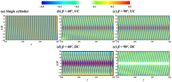For the single cylinder of finite length, the lift force along the cylinder oscillated simultaneously (Figure 4a), and the flow around the single cylinder was a two-dimensional phenomenon []. From a global perspective, the wake vortices shedding from the single cylinder were parallel to the cylinder, which is called parallel (P) mode (see Figure 6a).