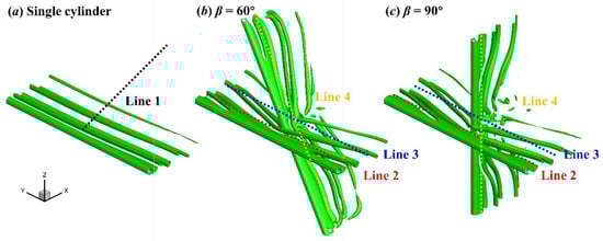 Since the lift force is related to the vortex shedding from the cylinders [,], the wake morphologies of the single and two crossing cylinders are presented by the λ2 iso-surfaces [] in Figure 6. λ2 is the second eigenvalue of the tensor Ψ2+ Ω2, where Ψ and Ω are the symmetric and the anti-symmetric parts of the velocity-gradient tensor, respectively.
