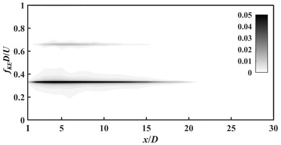 It is clear from Figure 9 that there were two distinct spectral peaks of StKE = fKED/U∞ = 0.32 and 0.64, which were two and four times the lift force frequency StL = 0.16 in Figure 5a, respectively. The free shear layers generated the shedding vortices on left and right boundaries of a cylinder. Since the vortex shedding on one side corresponds to the peak lift force and the next vortex shedding on the other side corresponds to the valley lift force, there were two vortex shedding phenomena in one lift force period, i.e., StKE = 0.32 = 2StL. A complete vortex shedding period T was approximately 6.25 s.