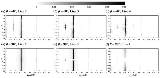 Contour of PSD calculated by the KE along lines 2, 3, and 4 in the wake of the two crossing cylinders in 60° (a–c) and 90° (d–f) arrangements.