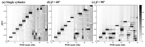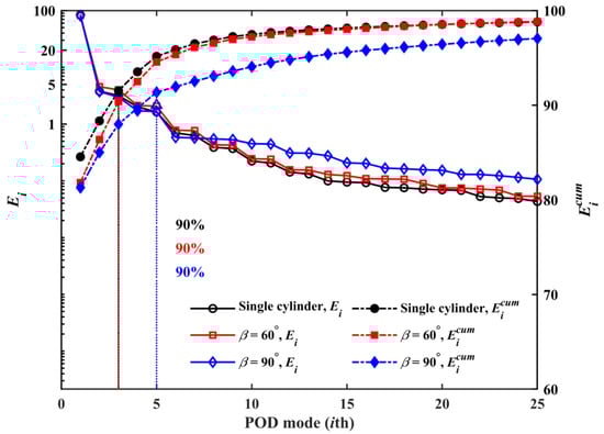 Figure 12 illustrates the relative energy of the first 25 POD modes and their cumulative energy. Overall, the energy of each mode decreased with increasing modal order. For the flow around the single and two crossing cylinders in 60° and 90° arrangements, the first mode had 84.55%, 81.82% and 81.29% of total energy, respectively. In addition, the first 3, 3, and 5 modes were needed to reach 90% of total energy, and the first 31, 29, 71 modes were needed to reach 99% of total energy, respectively. Statistics on modal energy show that the presence or absence of DC and DC’s arrangement significantly affected the convergence of the modal energy.