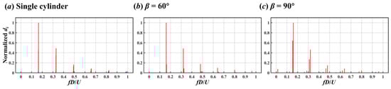 A fast Fourier transform (FFT) was further performed on the sectional lift force coefficient to calculate lift force’s power spectral density (PSD), and the contours of the Strouhal number StL = fLD/U∞ determined by the frequency of lift force fL is shown in Figure 5. It is clear from Figure 5 that the lift force frequency is StL = 0.16 and was not related to the inclination angle of DC. For the DC in 60° arrangement, there was a second high frequency of StL = 0.32 at the cylinder centre.