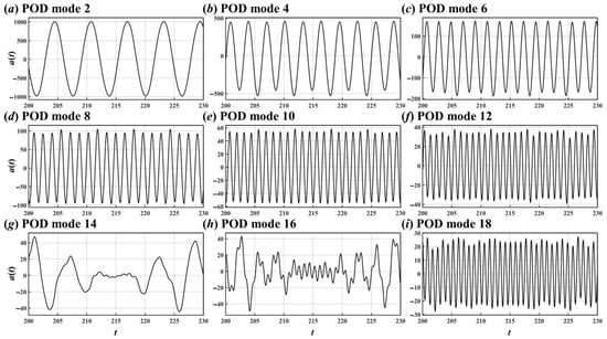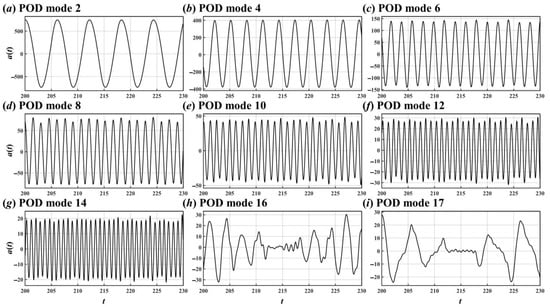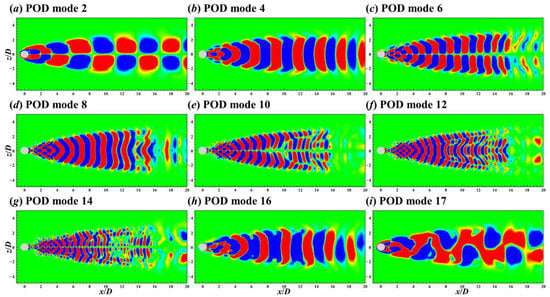 Although the 16th and 17th modes also represent the shedding vortices’ shift motion and vortex shedding phenomena, respectively, their flow patterns were irregular in both space (Figure 15h,i) and time (Figure 16h,i), and they had multi-frequency characteristics (Figure 17h,i).
