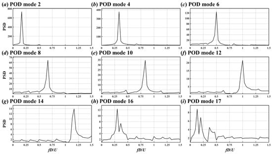 It is clear from Figure 17 that the 2nd, 4th, 6th, 8th, 10th, 12th, and 14th POD modes had a relatively prominent spectral peak, corresponding to St = 0.16, 0.32, 0.48, 0.64, 0.8, 0.96, and 1.12, respectively. For the 16th and 17th modes, there were substantial fluctuations in their time coefficients (Figure 16h,i) and these two modes had multiple spectral peaks (Figure 17h,i).