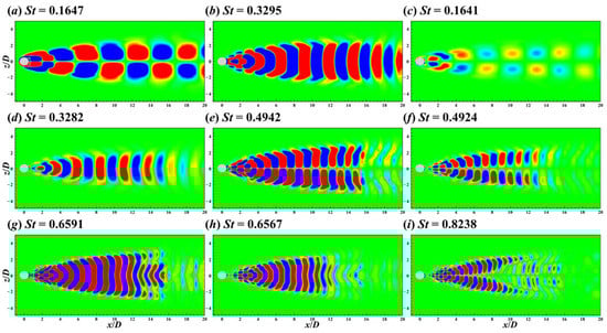 Because the vortex shedding frequency was calculated by lift coefficient is StL = 0.16 (see Figure 5a), the antisymmetric mode with a spectral peak of St = 0.16 is related to the vortex shedding from the cylinder. Similar to the decomposition results of rotating flows [,], the antisymmetric modes with a higher frequency peak (St = 0.48, 0.8, 1.12) differ only on spatial scale with respect to the mode with a low-frequency peak of St = 0.16. These antisymmetric patterns with no flow along the central axis of (y/D, z/D) = (0, 0) explain the absence of the St = 0.16, 0.48 signals in the KE spectrum of Figure 9.