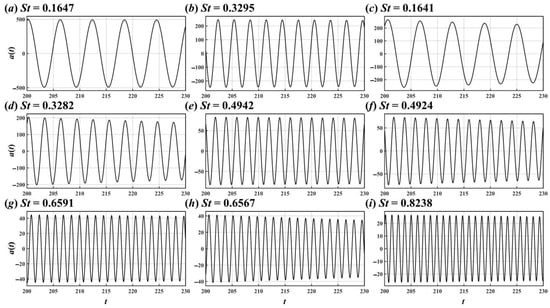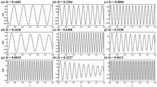 Time coefficients of the St = 0.1647 (a), 0.3295 (b), 0.1641 (c), 0.3282 (d), 0.4942 (e), 0.4924 (f), 0.6591 (g), 0.6567 (h), and 0.8238 (i) DMD modes for the flow around the single cylinder.