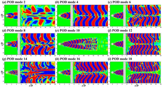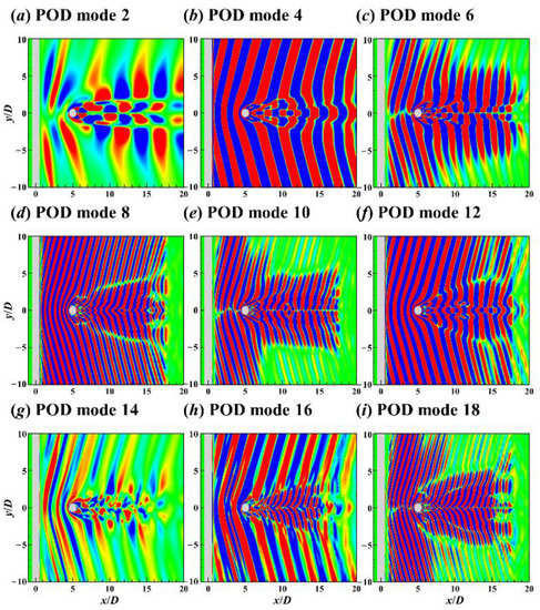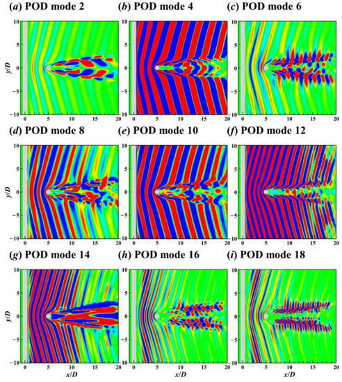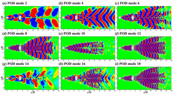 For the flow around the UC, it can be seen from the 2nd, 4th, 6th, 8th, 10th, 12th, and 18th POD modes in Figure 20 that the modal patterns in the range of 0.5 < x/D < 4.5 were the same as those of the corresponding modes in the single cylinder case (Figure 15). When the shedding vortices from UC centre encountered the DC, these modes’ symmetry and anti-symmetry remained unchanged (see Figure 20 and Figure 21). Furthermore, because the cross section of the DC arranged at 60° on the xz plane is an ellipse, diffraction of the flow caused the DC wake to expand in the z direction (Figure 20).