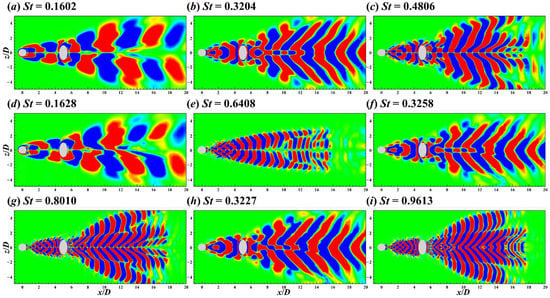 For the antisymmetric mode with St = 0.1600 (Figure 32a), the flow around the DC centre became narrower in the y direction due to UC wake’s induction and DC’s blockage effect. For the symmetric mode with St = 0.3199 (Figure 31c and Figure 32c), symmetric flow patterns were not found on the central axis (y/D = 0, z/D = 0) in the range of x/D = 5.5–9 due to the blockage of DC. In addition, there was a low-frequency flow pattern in the wake of the DC centre (see Figure 31h and Figure 32h). The low-frequency mode is related to the low-speed flow under the shadowing effect of DC.