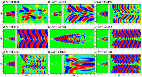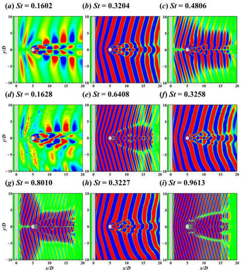 Vortex-induced vibration (VIV) of a circular cylinder has always been of interest to researchers due to its engineering applications [,]. In particular, if the self-oscillation frequency of a downstream structure is close to the vortex shedding frequency from the upstream circular cylinder, the structure will be destroyed by resonance [,,]. Therefore, the relationship between wake morphologies and flow frequencies is worth studying.