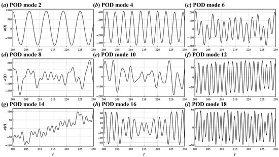 Time coefficients of the 2nd (a), 4th (b), 6th (c), 8th (d), 10th (e), 12th (f), 14th (g), 16th (h), and 18th (i) POD modes for the flow around the two crossing cylinders in 60° arrangement.