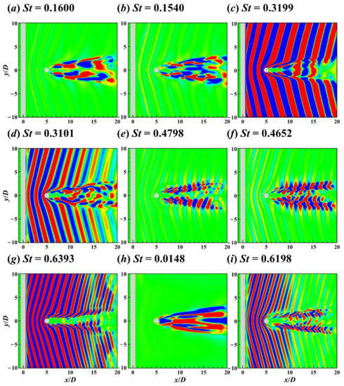 The combination of Figure 15 and Figure 17 shows that spatial patterns of the modes with a spectral peak of odd multiples of St = 0.16 (St = i × 0.16, i = 1, 3, 5, 7) were antisymmetric in space and those with a spectral peak of even multiples of St = 0.16 (St = i × 0.16, i = 2, 4, 6) were spatially symmetric.