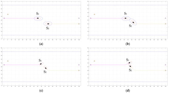Figure 17 shows that S1 has overtaken S2 and returned to the scheduled route. The turning point is [54.80, 59.46], and the turning angle is 14.94°. S3 and S4 form a crossing situation. According to the avoidance regulations, S3, as a give-way ship is passing the stern of S4. The avoidance point is [118.41, 43.44], and the avoidance angle is 53.29°. At this time, S4 and S2 form a crossing situation. S4 is a give-way ship and needs to give way from the stern of S2. The avoidance point is [126.65, 74.31], and the avoidance angle is 16.91°.