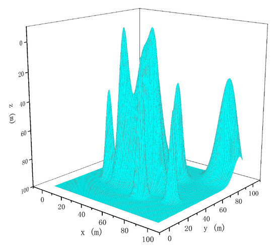where is the number of obstacles, represents the central coordinate of the obstacle, is the terrain parameter, controls the height of obstacles, and respectively are the attenuation amount and control slope of the obstacle along the -axis and -axis, is the height of the terrain expressed as the absolute position .