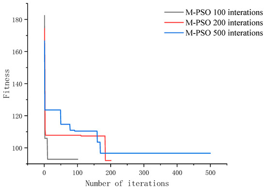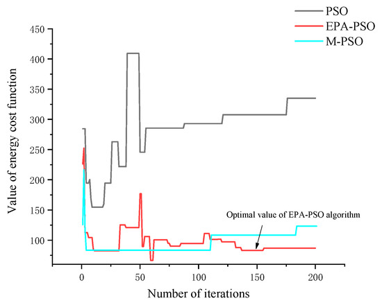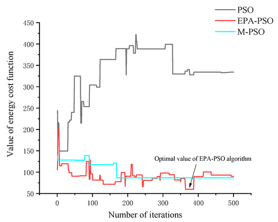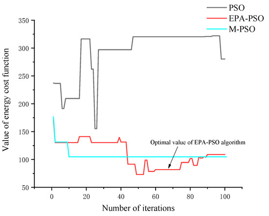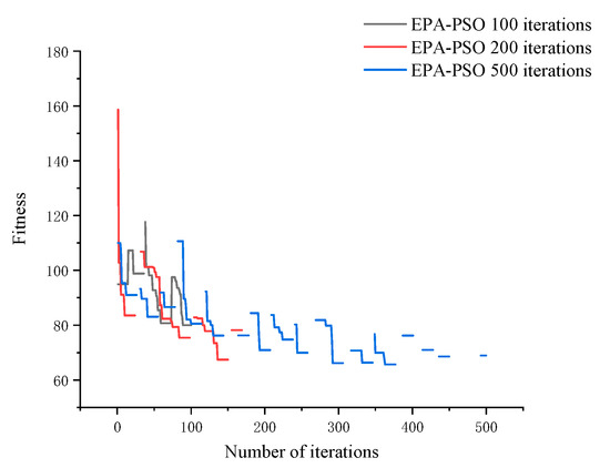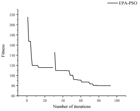 Figure 4 shows that with the increase in iteration times with the traditional PSO algorithm, the problem of constant fitness of traditional PSO algorithm has become more and more prominent, which will lead to too many instances of staying on a solution that satisfies the constraint and wastes too much time. M-PSO has the same problem, the algorithm will be too precocious, the fitness will not change much for the later iteration. It can be seen in Figure 6 that although the convergence speed of the EPA-PSO algorithm proposed in this paper is slower, it can solve the premature problem of the traditional PSO algorithm, enhance the random searchability of the traditional algorithm, and make it more likely to find the optimal solution in line with constraints.