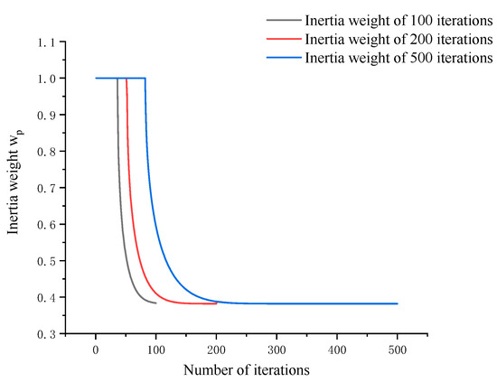Inertia weight adjustment strategy as shown in Figure 7 shows the rate of its adjustment is not static, but gradually decreases with the increase in algebra. When the algebra is small, the update rate is relatively slow, which makes the algorithm have a good global searchability. With the increase in algebra, it gradually decreases, thus enhancing the local searchability.
