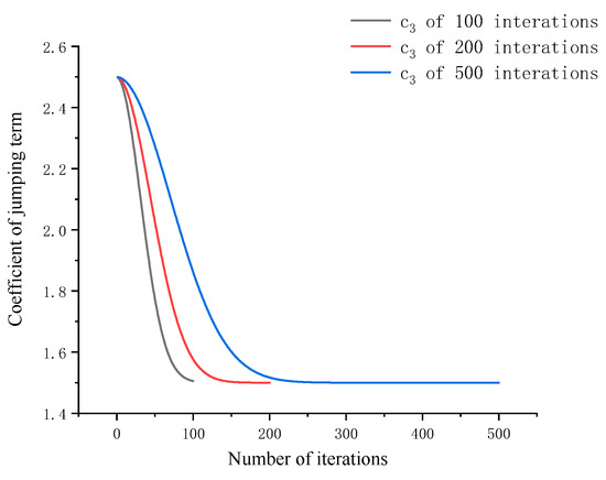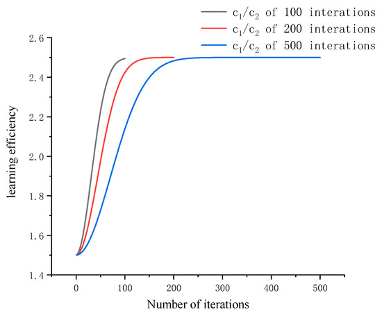 Figure 8 and Figure 9 are , , respectively. With the number of iterations increasing, and first increase slowly, then increase rapidly, and finally tend to be stable, which makes it have a better global search ability at the initial stage of iteration, and then enhances its local search ability. With the increase in iteration times, will gradually become smaller, which means that particles are more and more trusting in the judgment of individuals and populations in the process of evolution, and will reduce the probability of speed jump.