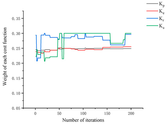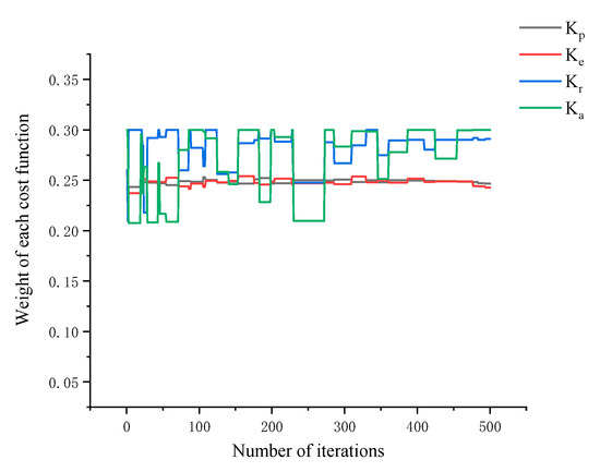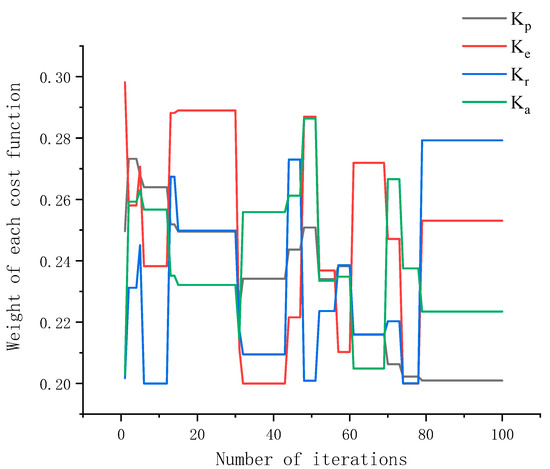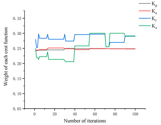 Figure 10, Figure 11 and Figure 12 can reflect that the weight of each cost function can be dynamically adjusted during the implementation of the algorithm, that is, the reward and punishment mechanism of the cost function takes effect and makes the algorithm run in the direction of the optimal solution more effectively.